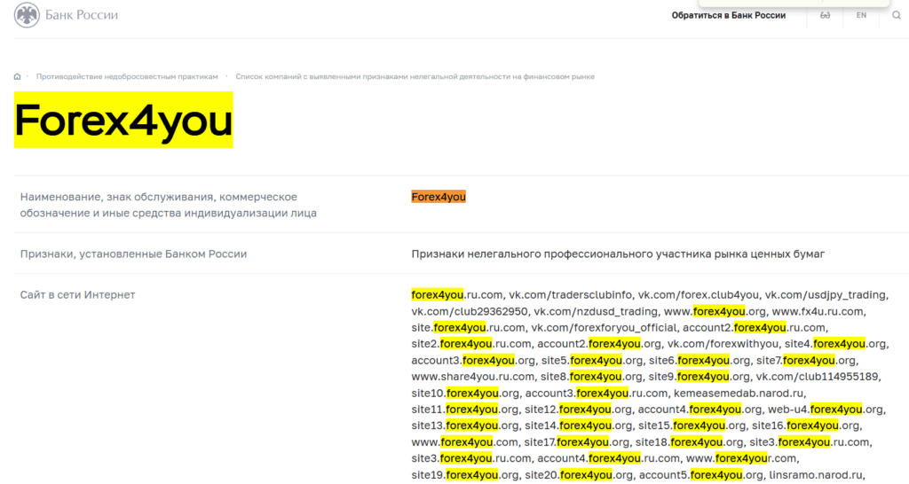 В предупреждении четко сказано, что компания «Forex4you» осуществляет деятельность на территории РФ без соответствующего разрешения (лицензии). ЦБ РФ прямо предупреждает граждан о рисках работы с этим брокером.